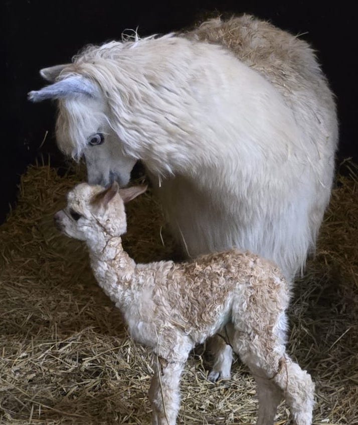 Unsere Alpakastute Kaya hat heute morgen die kleine Kyra zur Welt gebracht. Wegen der Kälte sind die beiden gut geschützt im warmen Stall untergebracht.